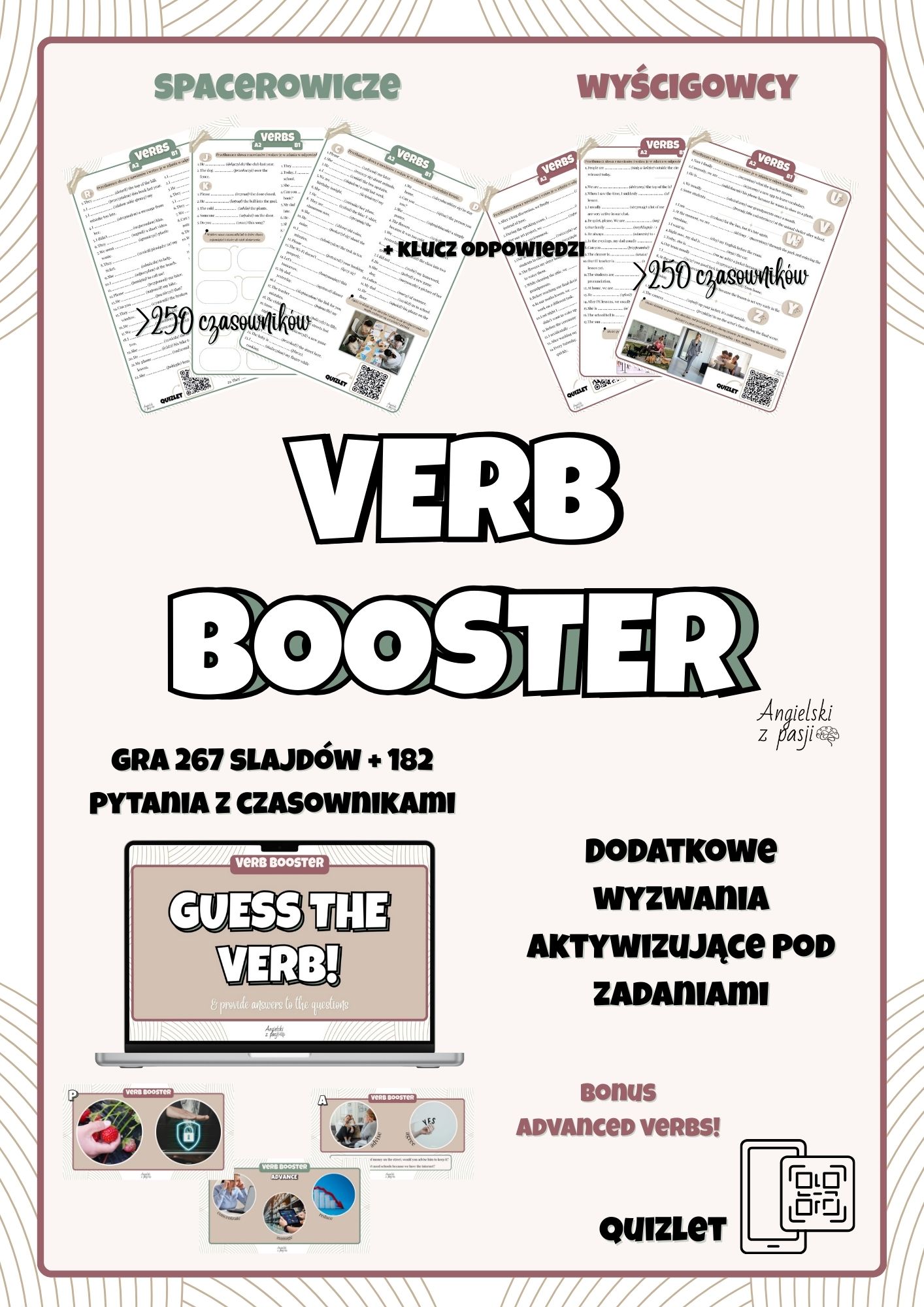 • Prezentację (PDF) z grą GUESS THE VERB! zawierającą czasowniki z setu oraz 182 dodatkowe pytania pytania.